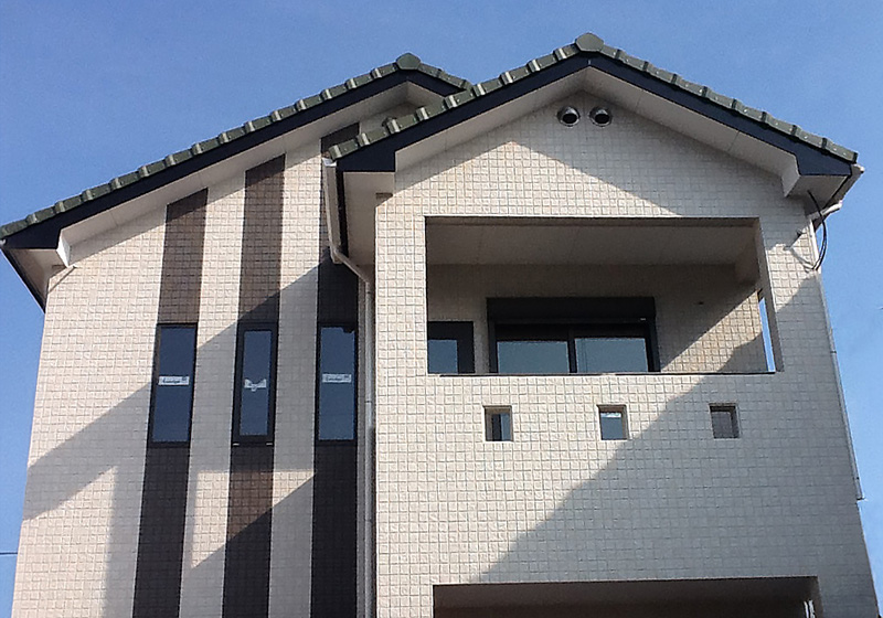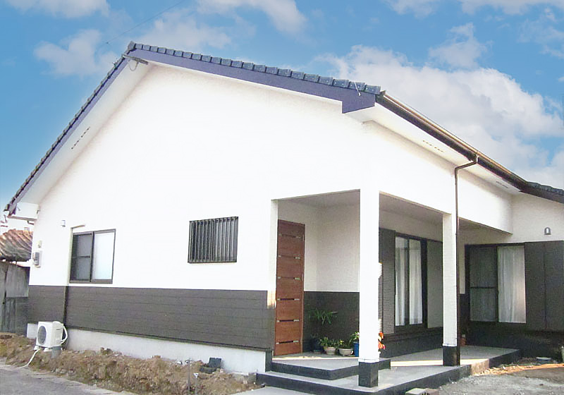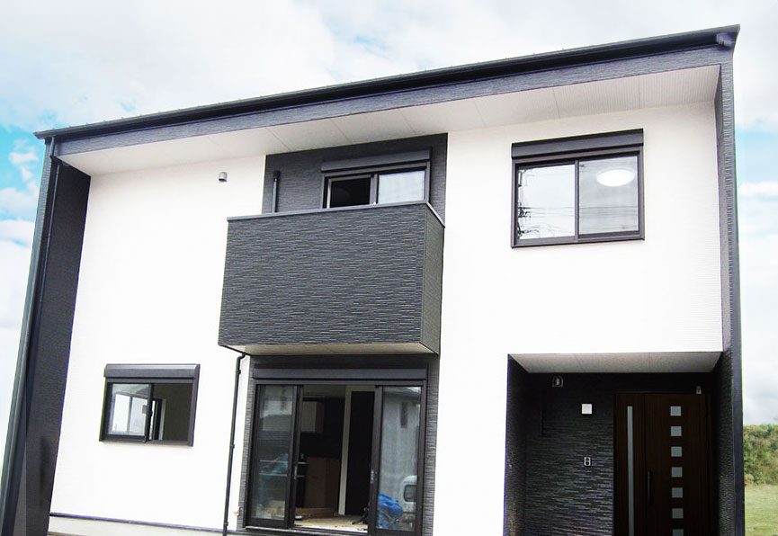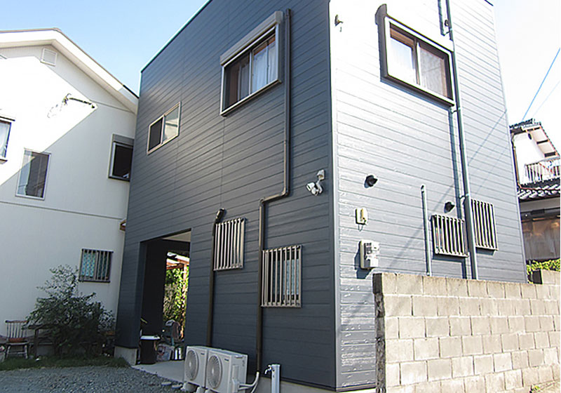 ネイビーのガルバニウムと真っ白な塗り壁のコントラストが美しいかっこいい家