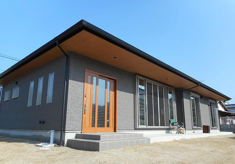 雨でも安心、玄関前のテラス屋根、室内は圧巻の27帖のリビング