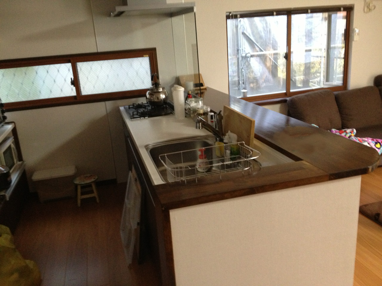 壁付けのキッチンから、対面型へレイアウトを変更、家族の様子が見えます。