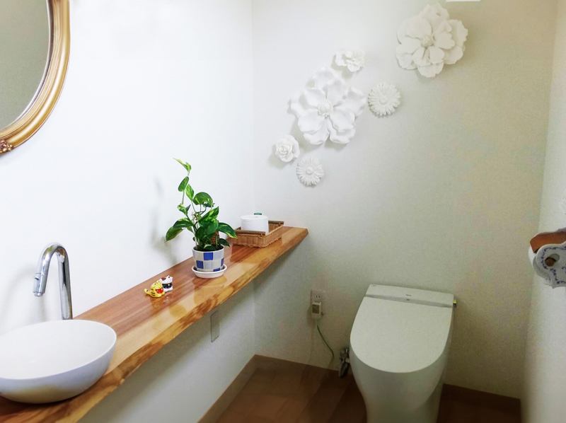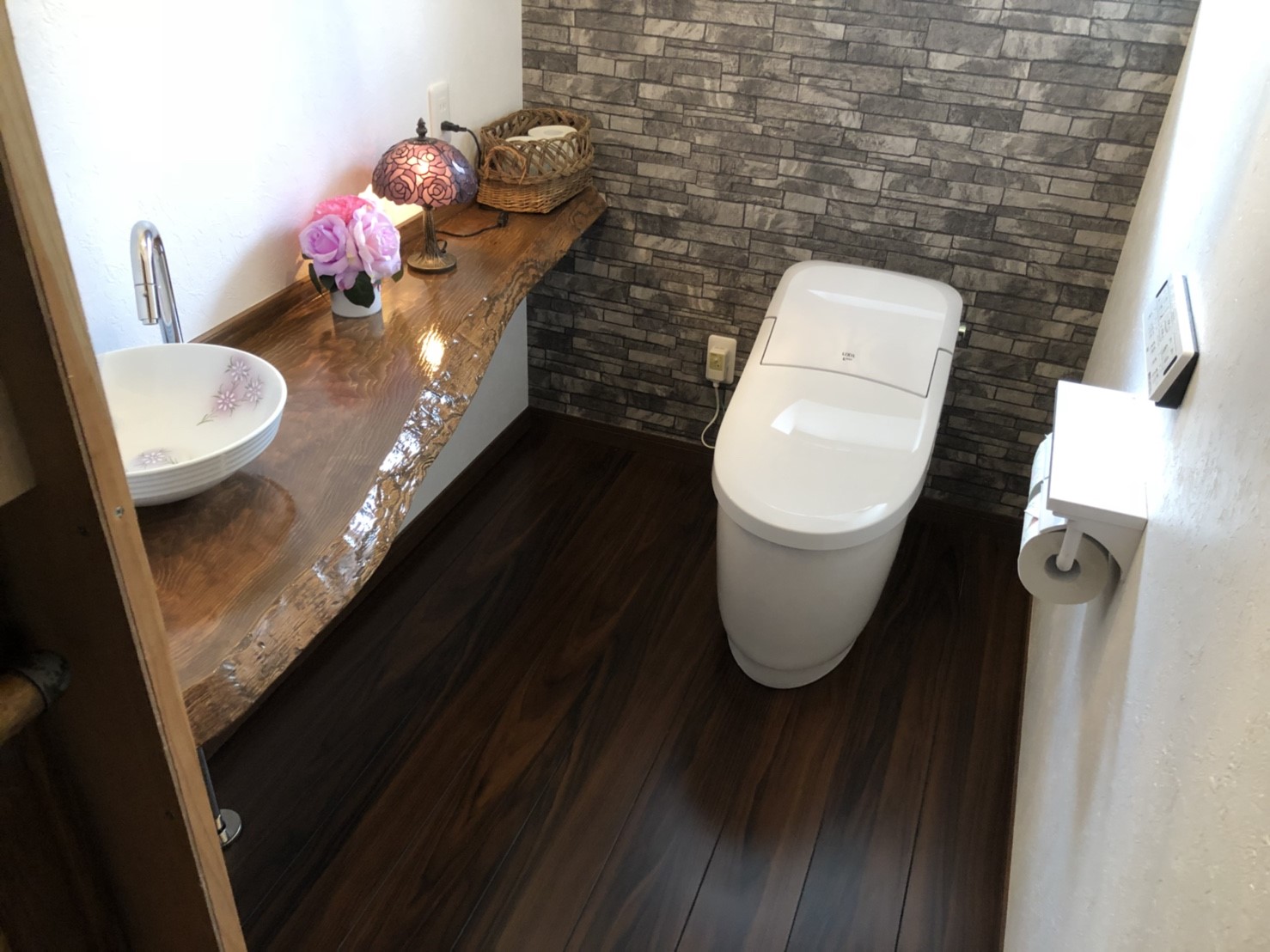 弊社事務所のトイレになります. カウンターには一枚板を使い木の温かみをプラスしました。